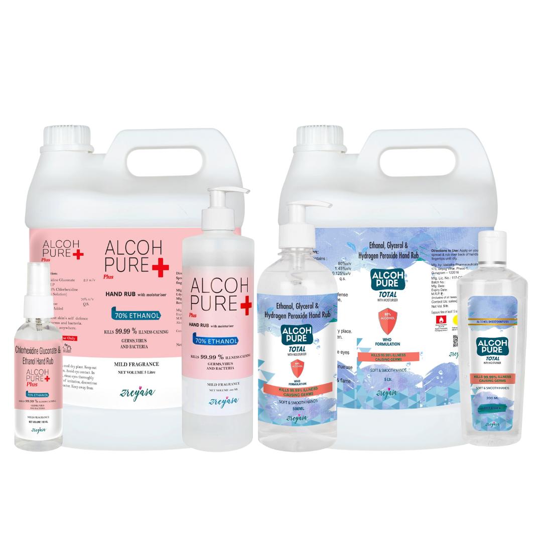 Alcohpure disinfectant sanitizers contain ethyl alcohol (ethanol). Alcohpure Total is 80% Ethanol Hand...